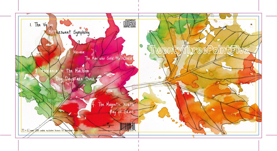 I was also inspired by Mucha’s Four Seasons, where each woman personifies a different season. I mapped each song in my compilation to a different season as I worked through the booklet – Spring, Summer, Autumn and Winter – so adding another dimension to my illustrations and a flow between the tracks. I named the compilation 23.5 degrees, which is the angle at which the Earth spins, so creating the seasons.