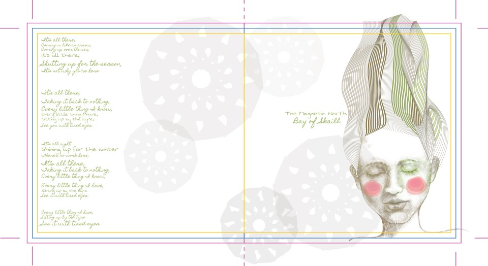 I used the Pen Tool in Adobe Illustrator to create page templates complete with bleed, margins, crop marks and score lines. As well as developing artwork for each spread, I also explored typography, sourcing public domain or open font license typefaces which worked with the artwork and helped to express the feel of each track. I created the front and back cover of the CD, the front and back cover of the leaflet, a spread for each track in the pull-out, and a “filler” spread in the leaflet to balance the pagination before putting the spreads for the booklet into Adobe In-Design in order to paginate the pull-out.