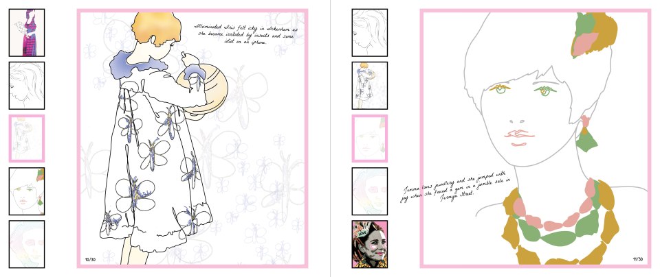 Response: I created a book to showcase some of my illustrations. Much of my work to date is feminine and delicate and often focuses on the female subject. I therefore designed the book around an A to Z of girls names, linking in London place names and landmarks within the text to give the concept and text another dimension. After much exploration into different layouts, I created a web-style layout within the book, using thumbnails and coloured borders as web navigation might. The delicate illustrations needed to be anchored on the page and cropping imagery and using borders around images seemed to provide one solution to this problem. I wanted the book to feel personal and so I added text in a handwritten typeface, at different angles on different pages, as if the words might have been jotted down by the author. If you click into a thumbnail image below, you can flick through the finished book design (NB. the first slide incorporates both the back and the front cover).